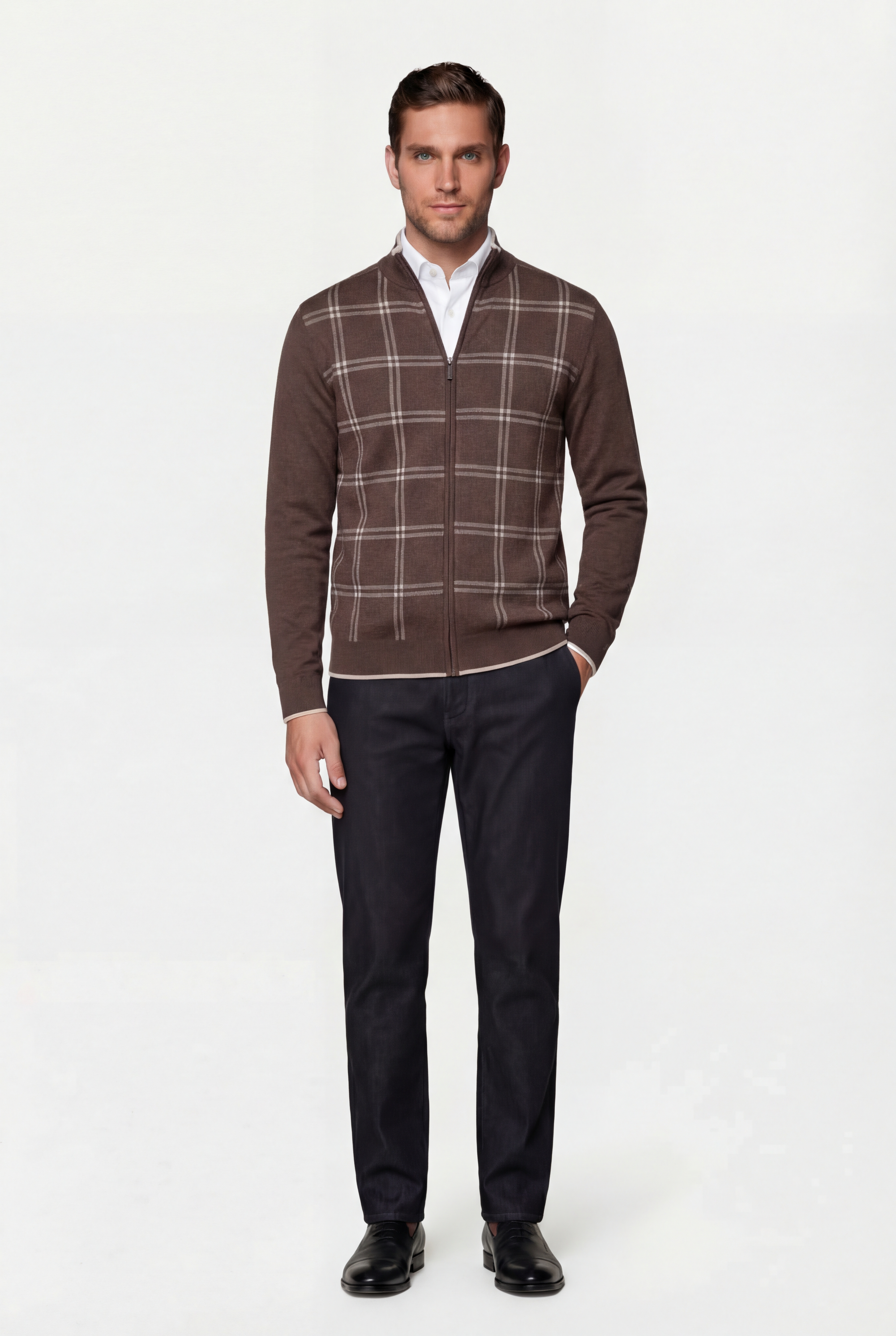 • Стильный и практичный мужской кардиган от бренда CAIOMARIO. Этот кардиган сочетает в себе элегантность и комфорт, что делает его идеальным выбором для повседневной носки, работы или неформальных встреч. Изготовленный из качественного материала, он обеспечивает удобство и тепло, что особенно важно в прохладное время года. Классический коричневый цвет с клетчатым узором придает кардигану элегантный и стильный вид. Этот узор подходит для создания как делового, так и повседневного образа. Кардиган оснащен удобной застежкой-молнией, что делает его практичным и функциональным. Рукава и низ изделия имеют эластичные манжеты, которые обеспечивают отличную посадку и защиту от ветра. Высокий воротник защищает шею от холода, добавляя дополнительный комфорт в холодную погоду. Кардиган CAIOMARIO — это стильный, удобный и универсальный элемент гардероба, который станет отличным выбором для любого мужчины. Благодаря качественным материалам, продуманному дизайну и универсальности, этот кардиган обязательно понравится тем, кто ценит комфорт и стиль.